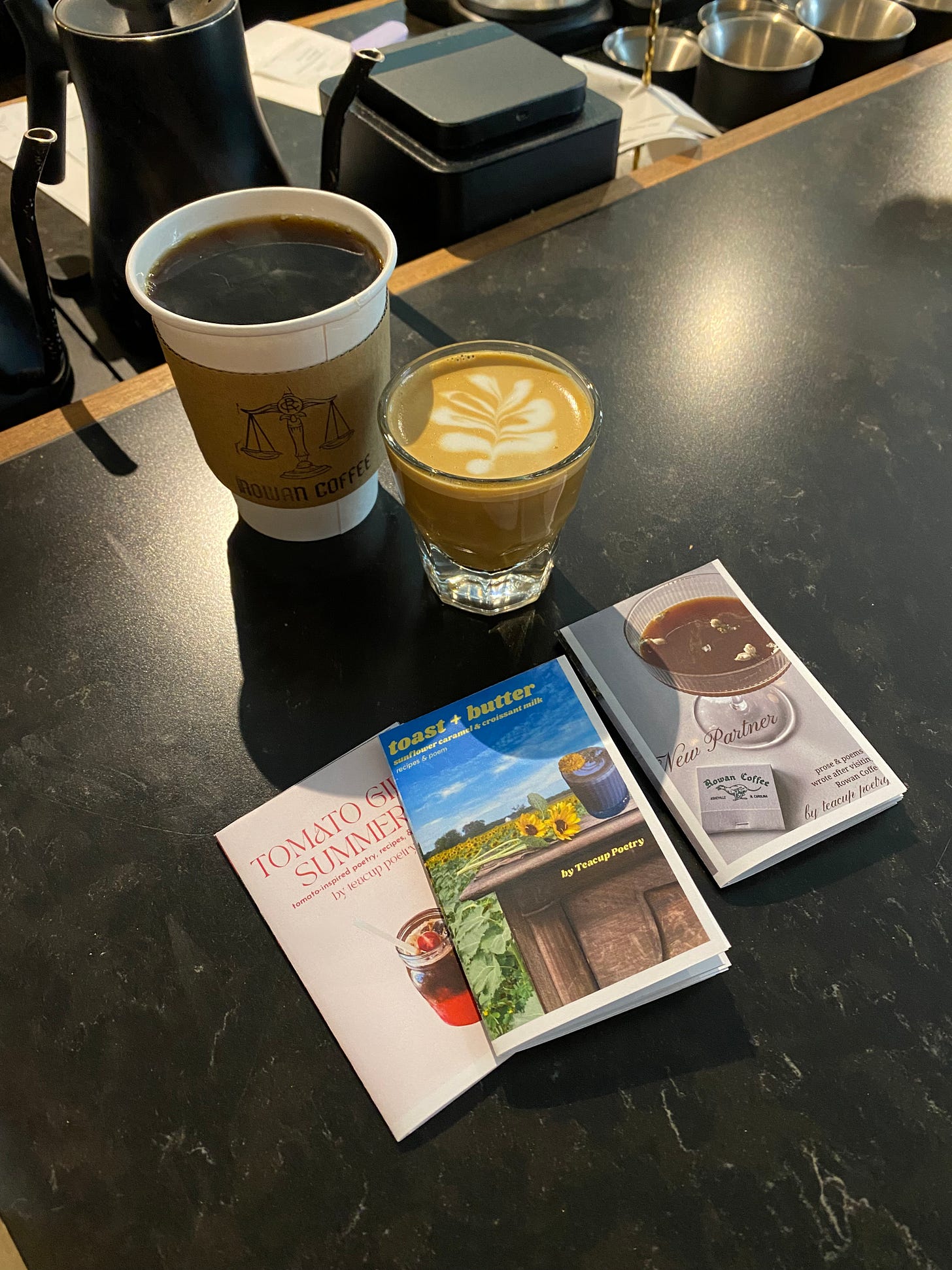 a cortado, a drip, and a feta-spinach croissant (not pictured) at rowan the morning of the zine fest