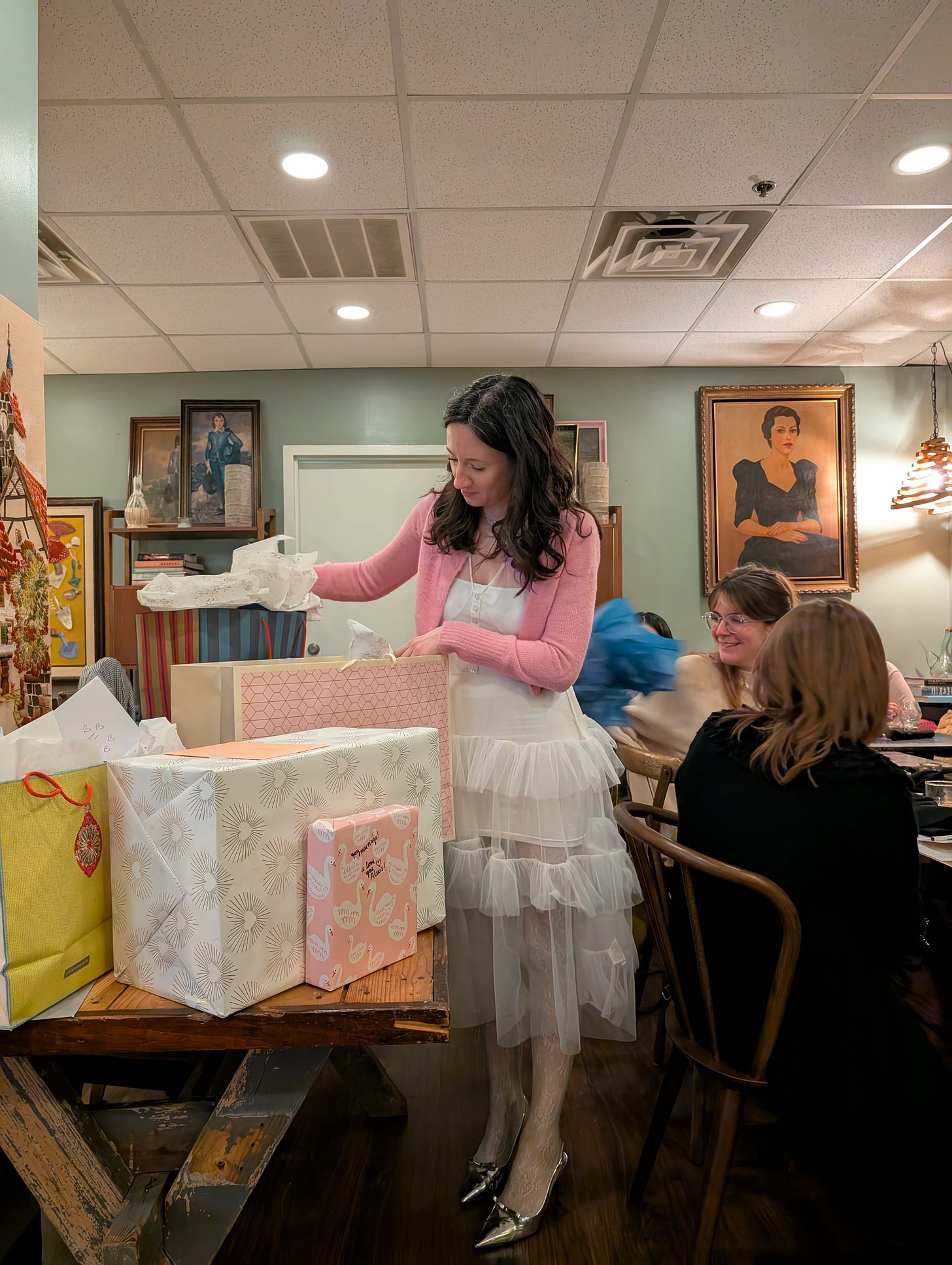 my bridal shower theme was yule. we gathered in a cozy wine room for brunch. I made miniature yule log party favors. I wore a white tulle dress (on sale at anthro!!), white lace tights, a pink cashmere Kimchi Blue cardigan, a crescent moon necklace, my silver shoes. the beautiful women in my life (and Andrew) spoiled me and celebrated Jacob and me. afterwards, I had another round of rosé in the restaurant with three of my oldest friends and started to plan the bachelorette trip. it was a magic.